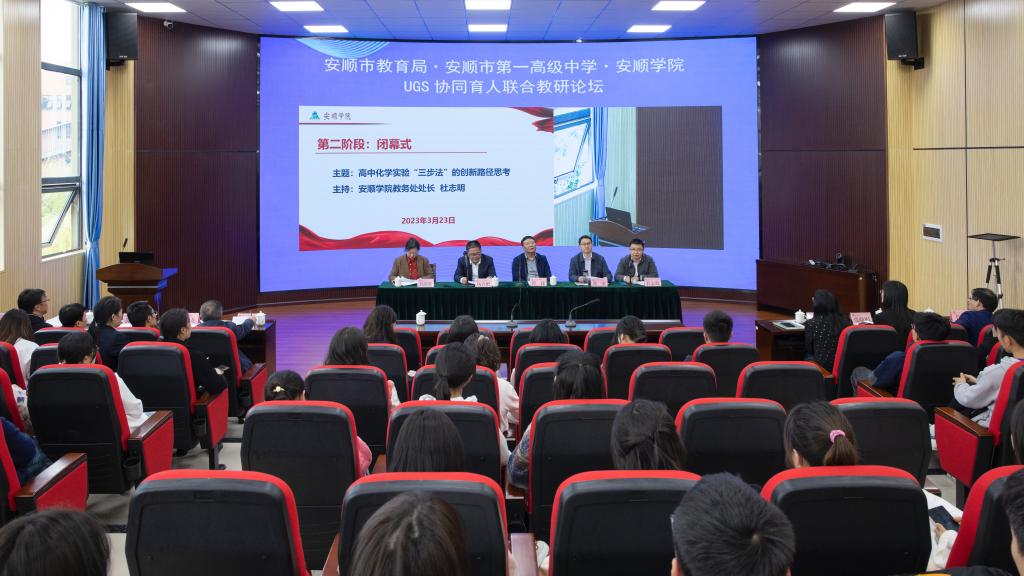2023年3月24日下午,安顺市教育局、安顺市第一高级中学、安顺学院U-G-S协同育人联合教研论坛(第一期)在安顺学院安道楼第三会议室举行,论坛主题为“高中化学实验‘三步法’的创新路径思考”。安顺市教育局原副局长、一级调研员程捷、安顺市教育局教科所所长杨燕鸣,安顺市第一高级中学校长杨启肥,安顺学院副校长张来,安顺学院党委委员、统战部部长、教务处处长杜志明出席本次论坛。安顺市教育局教科所教研员,安顺市第一高级中学化学教研组组长,安顺学院教务处、化学化工学院、数学与计算机学院相关负责人及化学专业学生参与此次论坛。