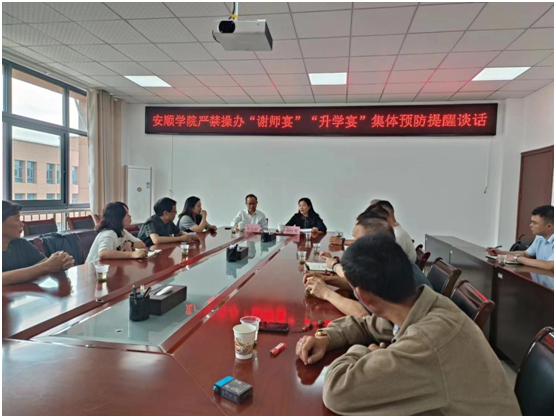 “当前,正值2023年中、高考招录升学之际,为深入贯彻落实中央八项规定精神,坚决遏制大操大办等……”。2023年8月29日上午,安顺学院党委、纪委主要领导对摸排出涉及子女升学的13名干部职工进行预防提醒谈话,敲响“升学宴”“谢师宴”的警钟。