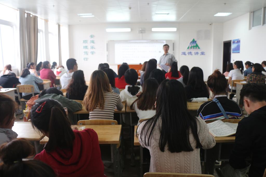 2019年10月8日下午,安顺学院“传统价值观的时代思考”专题讲座在学校道德讲堂举行。安顺学院教育学院院长李镇译教授主讲,教育学院学生听讲。