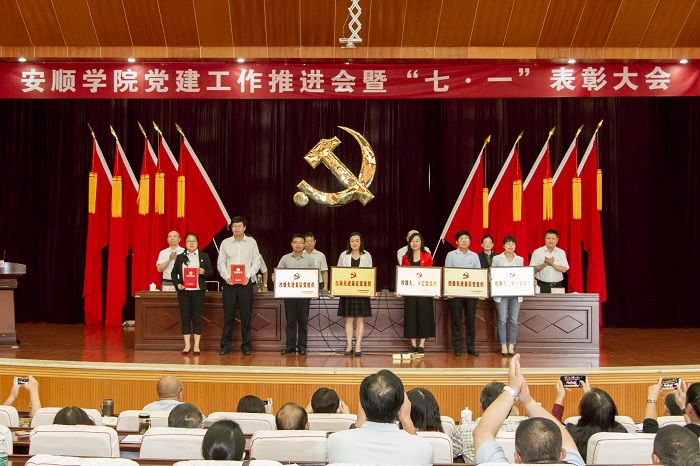 2018年6月22日下午,安顺学院党建工作推进会暨“七·一”表彰大会在学术报告厅隆重举行。安顺学院党委书记罗荣彬,党委副书记、院长刘雷,党委副书记陶文彩,党委委员、副院长熊国敏,党委委员、副院长王芳恒,党委委员、纪委书记马力,党委委员、副院长郭本华出席大会。全校副科级以上干部,机关党总支全体党员、受表彰的党组织和党员代表参加会议。会议由刘雷院长主持。