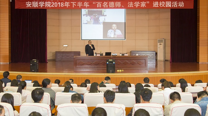 为贯彻落实中共贵州省委办公厅贵州省政府办公厅印发的《关于进一步加强和改进新形势下全省高校宣传思想工作的实施意见》的通知精神和省教育厅、省文明办、省民政厅、省司法厅、省法治宣传教育工作领导小组办公室下发的《关于开展“百名德师、法学家”进校园的通知》精神,安顺学院开展了2018年下半年“百名德师、法学家”进校园活动。刘钢律师的“不负似水年华——青年大学生成长法治教育”专题报告会是该活动的其中一场。