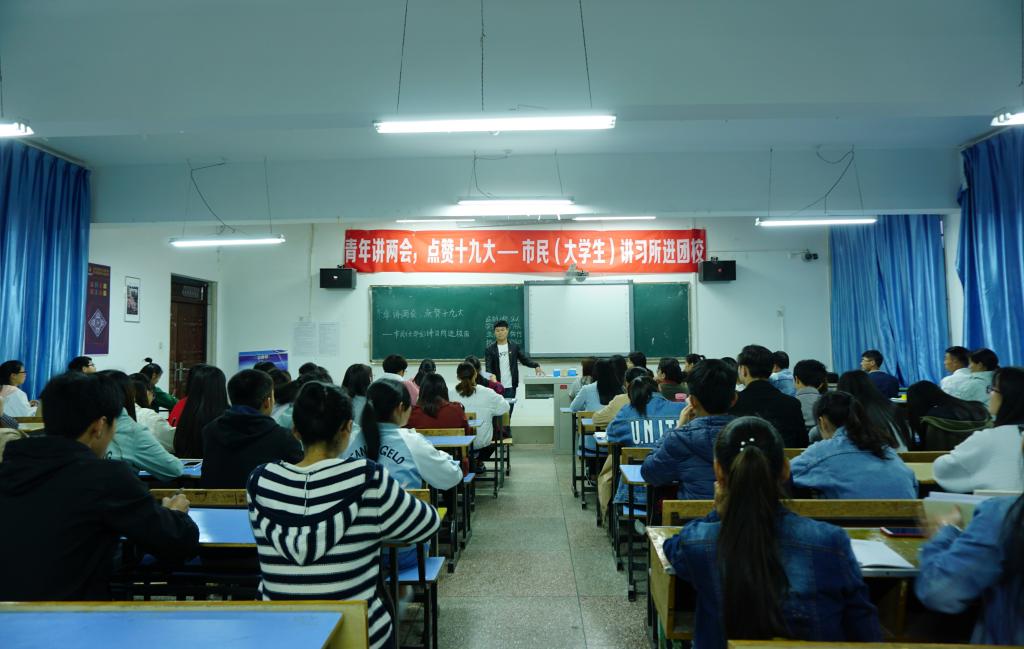 4月25日晚,安顺学院习近平新时代中国特色社会主义思想(大学生)讲习所进团校在学校新教学楼各团校学习点开展“青年讲两会 点赞十九大”主题宣讲。安顺学院习近平新时代中国特色社会主义思想(大学生)讲习所徐行等宣讲员主讲,共700余名团校学员听讲。