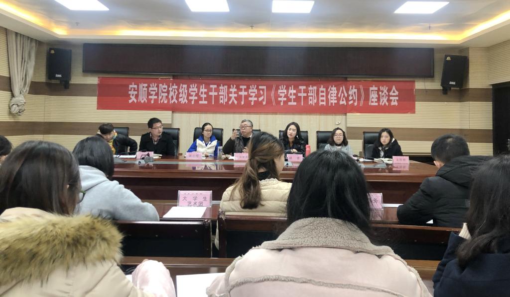 11月19号下午,校团委在特教七楼会议室召开“安顺学院召开校级学生干部学习《学生干部自律公约》座谈会”,安顺学院党委委员、副校长令狐荣涛,校团委副书记胡蕾以及团委工作人员、校级学生组织学生干部参加会议。