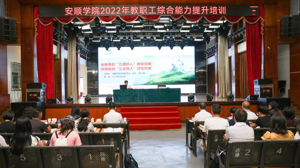 8月18日下午,安顺学院党委副书记、校长陈云坤以《全面落实“立德树人”根本任务 深度推进“三全育人”综合改革》为题作全校“三全育人”辅导报告。报告会为安顺学院2022年教职工综合能力提升培训会的系列培训之一,由安顺学院党委副书记陶文彩主持。