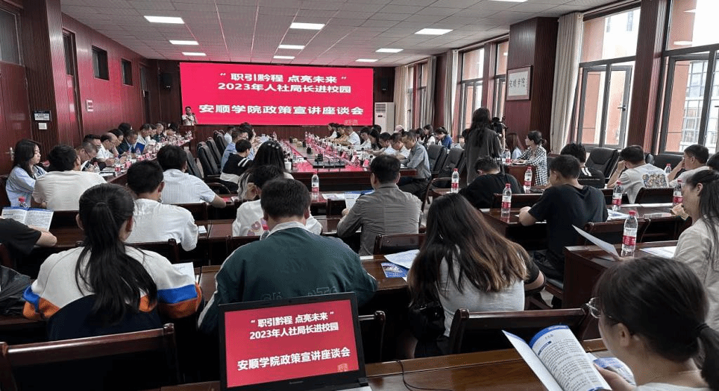 为深入贯彻党的二十大精神,全面落实党中央、国务院和省委、省政府关于高校毕业生就业工作的决策部署,促进毕业生高质量充分就业,6月19日上午,安顺学院在安道楼第一会议室召开“职引黔程 点亮未来”2023年人社局长进校园暨政策宣讲座谈会。安顺市委组织部副部长、人社局党组书记、局长梁正志一行到安顺学院进行政策宣传。安顺学院党委书记罗荣彬,党委委员、副校长殷红敏出席会议,教务处、人事处负责人,二级学院党委书记、就业专干,招就处全体人员及2023届毕业生代表参加会议。会议由殷红敏主持。