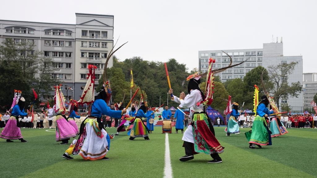之后,广播体操队员们精神饱满,热情高涨,认真投入,用整齐划一的动作,端庄秀丽的姿态揭开精彩的文艺表演。在铿锵锣鼓声中,首蒙青巾,腰围战裙,戴脸子于额前,手执戈矛刀戟之属的展演者用急如瀑雨,畅若飞燕的身姿再现金戈铁马的征战故事,再现被誉为“中国戏剧活化石”的安顺地戏。充满活力的踏板操激情律动,健身气功《八段锦》集国术精华之集如锦缎般柔顺。舞龙表演《龙腾盛世》将文艺表演再次推向高潮。