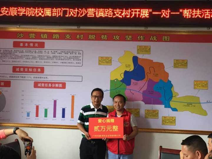 为积极响应我校校企参与脱贫攻坚工作,7月19日下午,我校食堂托管公司盛昌餐饮企业管理有限公司总经理熊春雷到关岭县沙营镇路支村进行爱心捐赠活动。路支村村支两委及扶贫驻村工作组全体人员参加了捐赠仪式。
