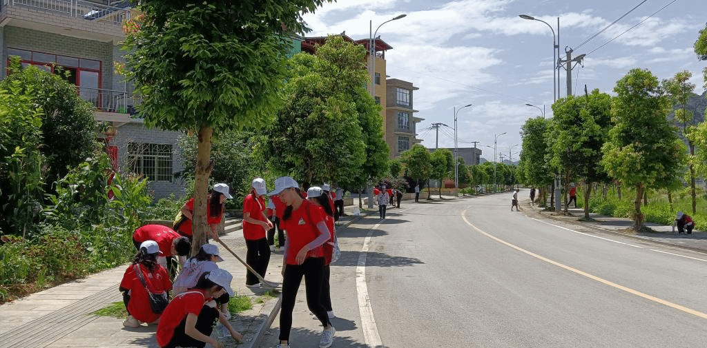 在推进卫生下乡上,实践队与黄鹤营村村民共同进行全面卫生整改,关于下翁弄组周边街道主要进行了排水口的淤泥处理和绿化区域的杂草清除,对于黄鹤营村公共区域的环境卫生主要展开了杂物的整理和杂草清除,实践队队员还协助村民一起对其屋前的不规范放置进行整理。
