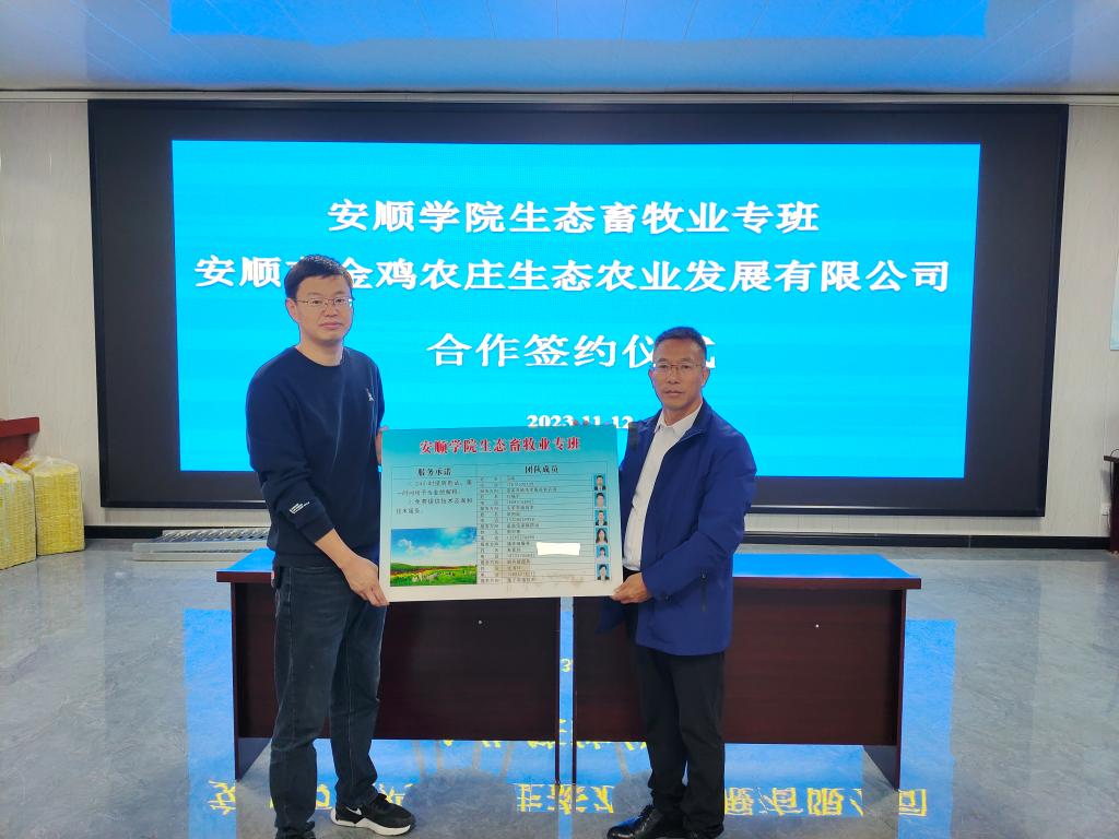 11月12日,安顺学院生态畜牧业专班负责人马明教授、农学院院长张玉波教授及专班成员等一行7人到安顺市金鸡农庄生态农业发展有限公司开展生态养殖技术指导,并签署了服务合作协议。金鸡农庄公司董事长助理朱文海出席签约仪式。