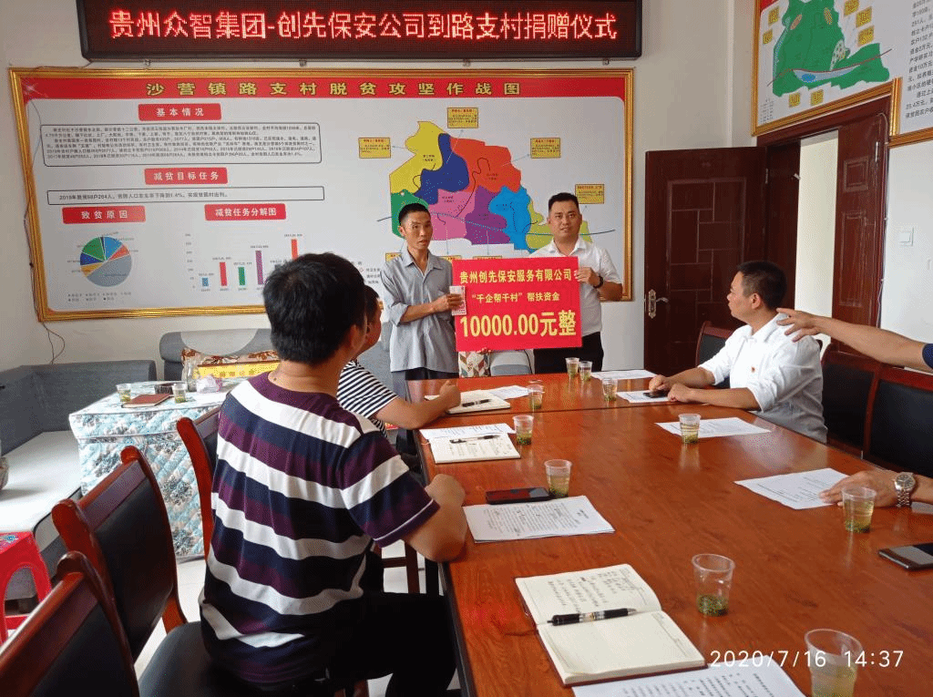2020年7月16日,紫云众智集团创先保安公司副总经理陈应斌、总经理助理李远恒一行到路支村捐赠资金及物资。安顺学院保卫处处长崔振国、副处长郝捷、路支村村支两委、驻村工作组、安顺学院保卫处及创先保安公司工作人员参加捐赠仪式。捐赠仪式由原驻村第一书记、安顺学院大学公共体育教学部副主任雷蕾主持。