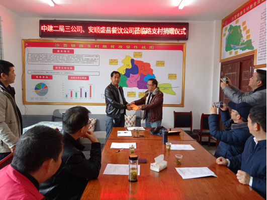 安顺市盛昌餐饮管理有限公司总经理熊春雷、中建二局第三建筑工程有限公司安顺项目部执行经理于海涛向路支村捐赠扶贫资金1万元,并分别讲话。