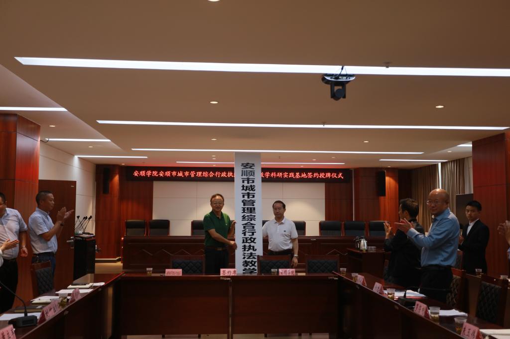 2019年9月9日上午,安顺学院与安顺市城市管理综合行政执法局共建教学实践基地签约授牌仪式在安顺市城市管理综合行政执法局9楼会议室举行。安顺学院党委书记罗荣彬,安顺市管理综合行政执法局党组书记、局长董立军,政法学院院长徐忠、市城市管理综合行政执法局党组成员刘坤,安顺学院发展与规划处副处长朱玉伟等参加了签约授牌仪式。