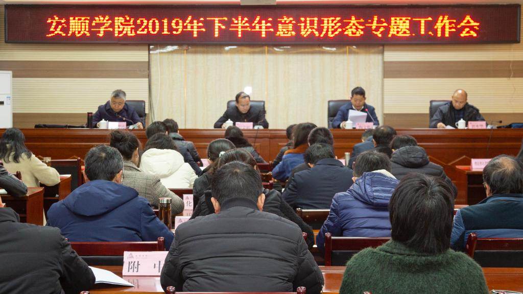 为认真贯彻落实党委(党组)意识形态工作责任制及中央和省委、省委教育工委、市委关于“不忘初心、牢记使命”主题教育的有关要求,进一步学习贯彻十九届四中全会精神。2019年12月19日,安顺学院2019年下半年意识形态专题工作会暨意识形态工作联席会在特教楼七楼会议室召开。党委书记罗荣彬、党委副书记陶文彩、副校长令狐荣涛、副校长郭本华出席,各职能部门主要负责人,各二级党委书记、院长参加会议。会议由陶文彩副书记主持。