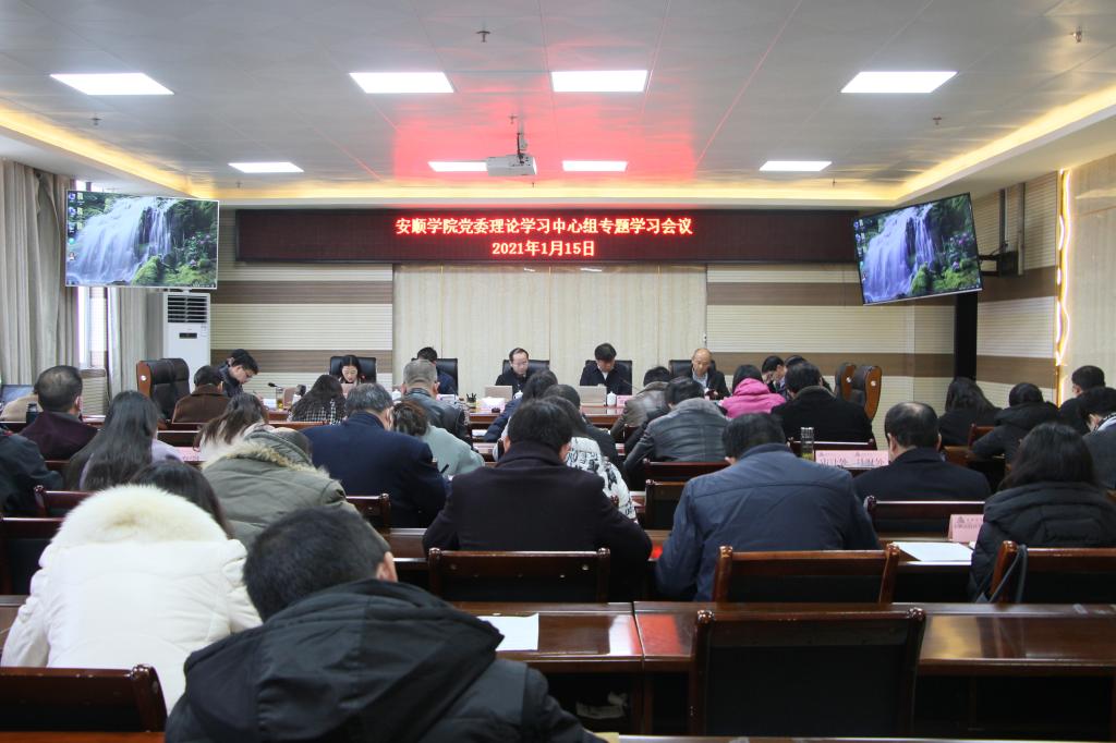 2021年1月15日,安顺学院党委书记罗荣彬主持召开安顺学院党委理论学习中心组专题学习会议,学习习近平在省部级主要领导干部学习贯彻党的十九届五中全会精神专题研讨班开班式上的重要讲话、国家主席习近平二〇二一年新年贺词、《习近平谈治国理政》第三卷有关篇章、《习近平总书记教育重要论述讲义》有关章节、《论党的宣传思想工作》相关内容、《中国共产党章程》、《中共中央关于加强党的政治建设的意见》、中共中央办公厅印发《关于巩固深化“不忘初心、牢记使命”主题教育成果的意见》、全国宣传部长会议精神、《中国共产党统一战线工作条例》。