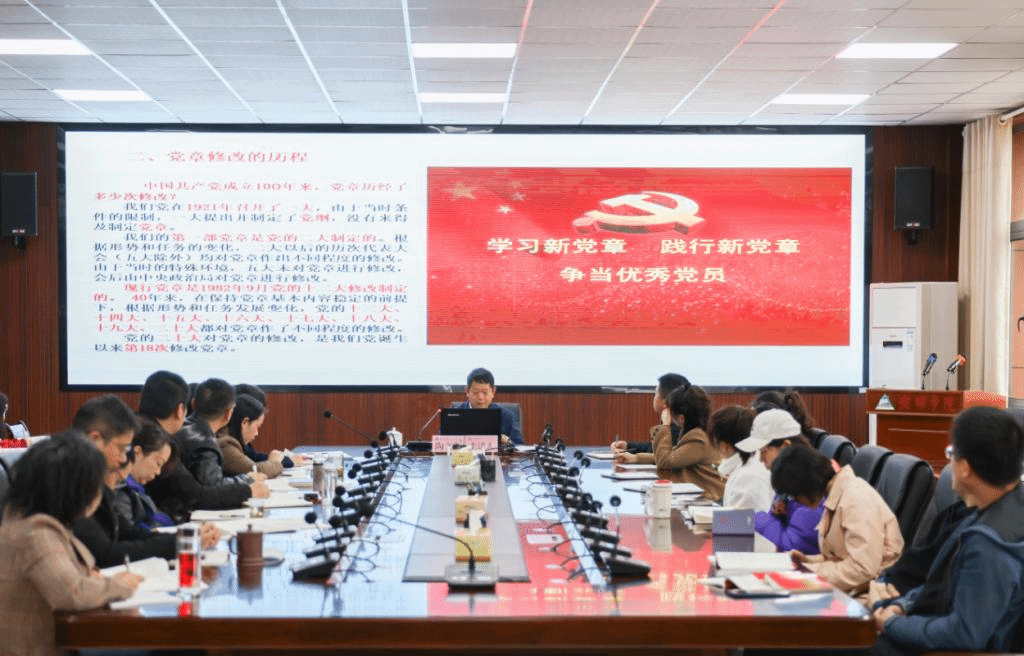 2022年11月24日,安顺学院党委副书记陶文彩为分管(联系)部门(学院)教职工生上学习新修订的《中国共产党章程》专题党课。学校党政办、党委组织部、党委宣传部、党委统战部、机关党委、团委、更名办全体人员,人文学院全体教职工及部分学生党员代表聆听。