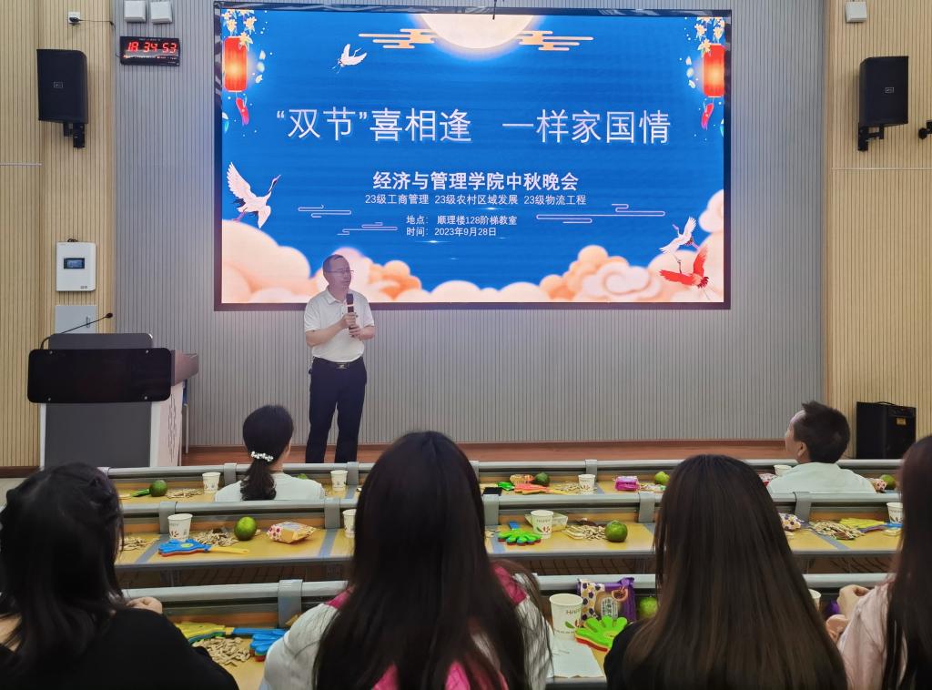 2023年9月28日晚,安顺学院经济与管理学院在顺理楼1-28教室组织召开“双节喜相逢  一样家国情”中秋晚会。安顺学院党委书记罗荣彬与中秋、国庆假期期间留校的2023级新同学欢聚一堂,喜迎中秋,共话团圆。安顺学院经济与管理学院党委书记张红霞、专职副书记周彰波、团总支副书记杨睿、2023级物流工程班班主任邓增强参加。晚会由2023级工商管理班班主任胡晓青主持。