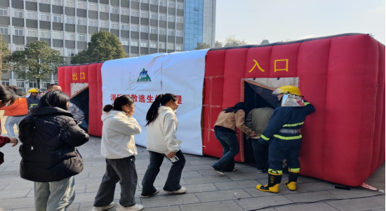 第二环节是消防逃生演练环节。在消防专业人员的指导下,师生们进行了模拟火灾逃生演练。演练现场,烟雾弥漫,警报声响起,师生们迅速用湿毛巾捂住口鼻,弯腰低姿,按照预定的逃生路线有序疏散到安全地带。整个演练过程紧张有序,师生们积极配合,达到了预期的演练效果。