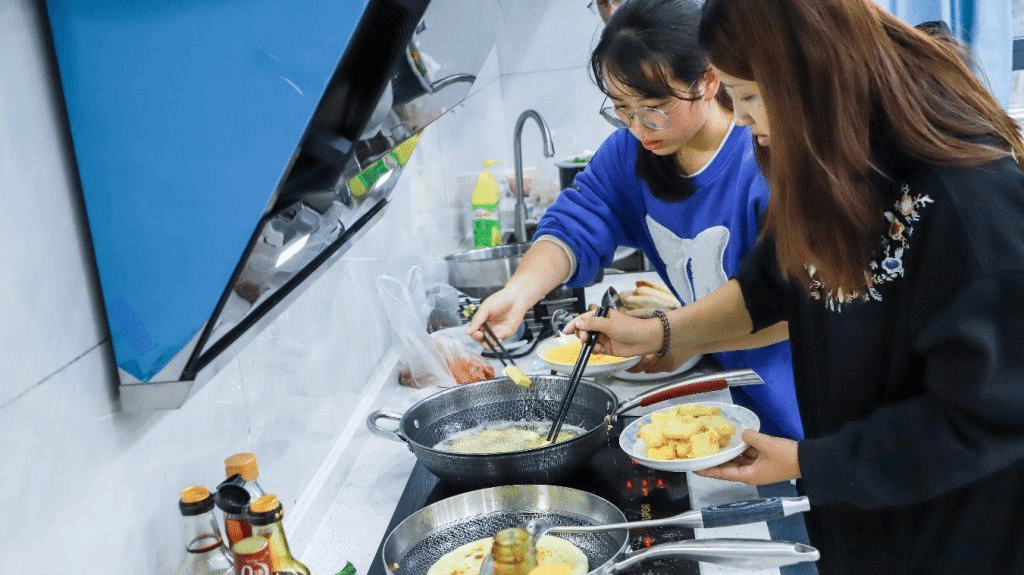 活动现场,热闹非凡。择菜、理菜、洗菜、切菜、配菜、炒菜… ……在锅碗瓢盆的碰撞中,14名同学轮流大展厨艺。煎、炒、蒸、炸、煮,花式手法轮番上阵;贵州菜、广西菜、河南菜………各地佳肴美味汇聚一堂。经过精心烹调,蒜爆虾、白切鸡、芹菜炒牛肉、可乐鸡翅、家常豆腐、河南大饼、凉拌黄瓜、西红柿炒鸡蛋………一道道热气腾腾的菜品陆续出锅摆盘。