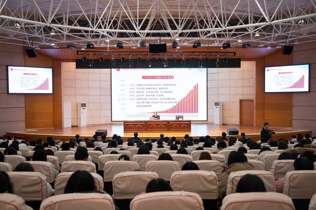 杨昌鹏从“从伟大成就中深刻理解改革开放是决定当代中国前途命运的‘关键一招’”“从党的二十届三中全会擘画的宏伟蓝图和战略部署中展望安顺美好未来”“在谱写中国式现代化安顺篇章的火热实践中贡献青春力量”等方面向师生讲授思想政治理论课。