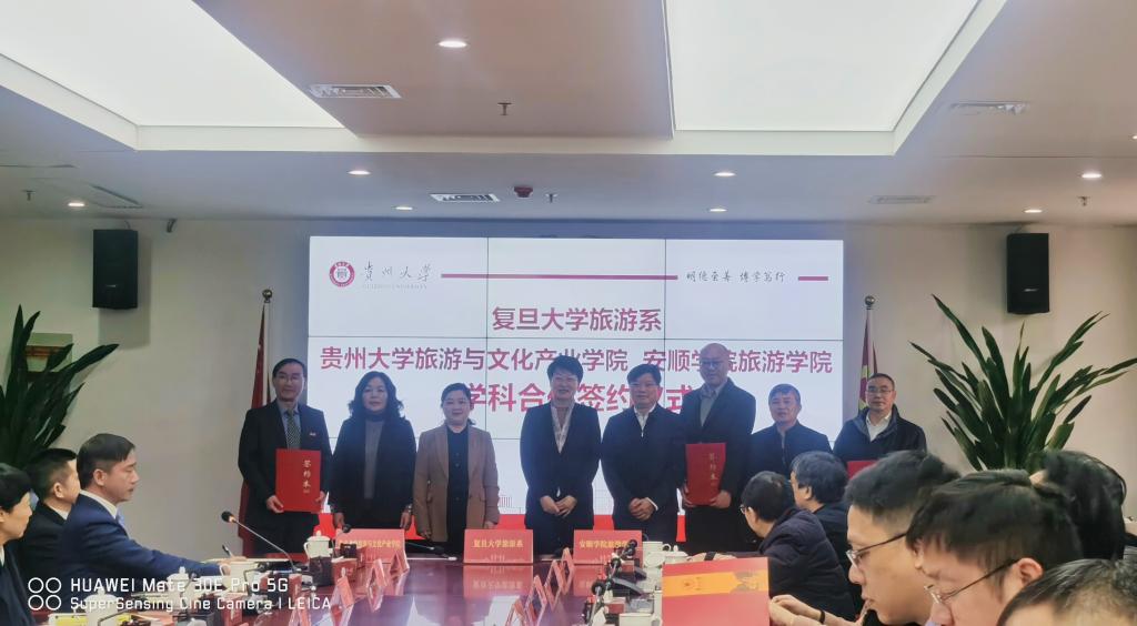 会上,复旦大学旅游学系与贵州大学旅游与文化产业学院、安顺学院旅游学院共同签署了“组团式”帮扶旅游管理学科合作备忘录