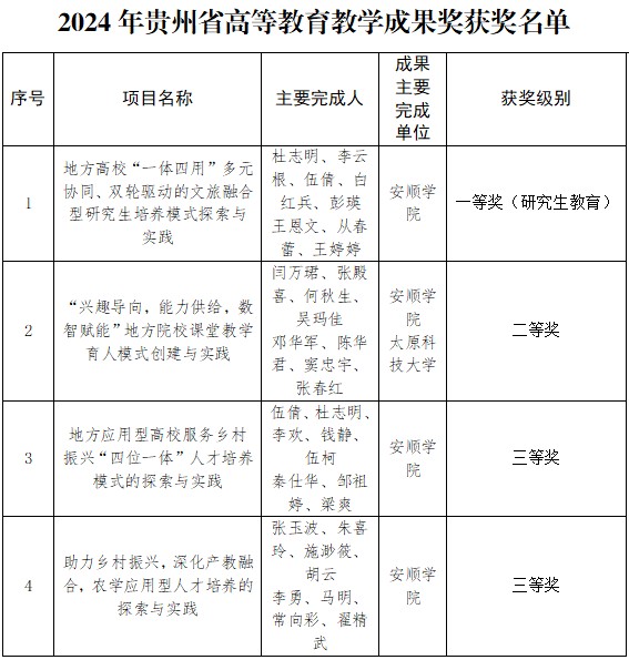 在近日公布的2024年贵州省高等教育教学成果奖获奖名单中,安顺学院喜获佳绩,共斩获4项奖项,其中一等奖1项、二等奖1项、三等奖2项,在数量和质量上取得双突破,尤其是实现了安顺学院在该奖项上一等奖的突破,标志着学校教育教学改革和创新迈上了新台阶,助推了学校的高质量发展。