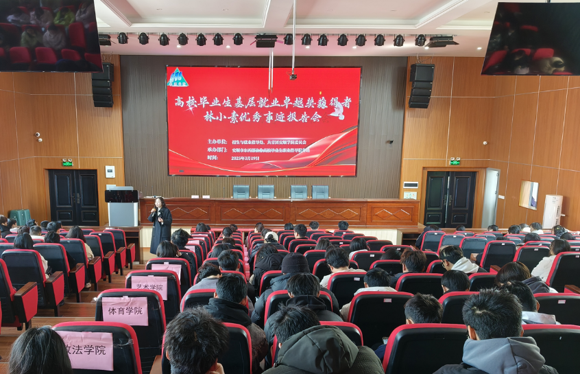 为引导学生向榜样学习,发挥就业典型的引领示范作用,3月19日下午,安顺学院在博学楼举办优秀毕业生基层就业经验分享会。教育部2023-2024年度高校毕业生基层就业卓越奖学(教)金获得者、安顺学院2015届汉语言文学专业毕业生林小素作为优秀毕业生作就业经验分享。安顺学院200余名师生代表参加活动。
