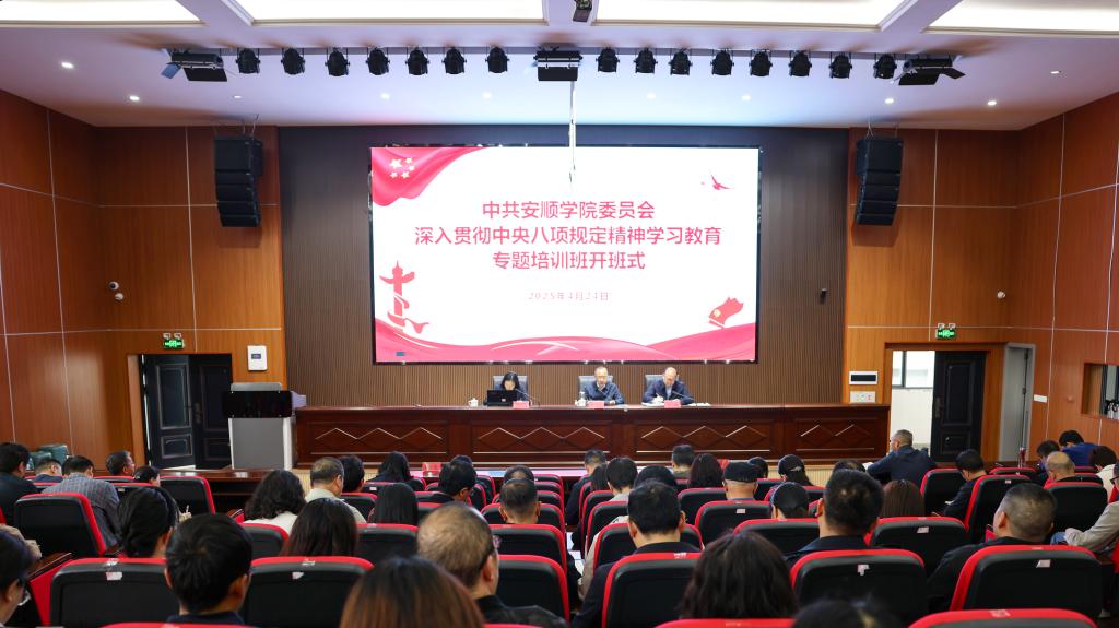 4月24日至25日,安顺学院举办深入贯彻中央八项规定精神学习教育专题培训班。培训集中开展了专题辅导、警示教育和分组讨论。全校处科级干部,年轻干部、关键岗位干部、新提拔干部、各党支部书记和学校学习教育专班全体工作人员参加培训。
