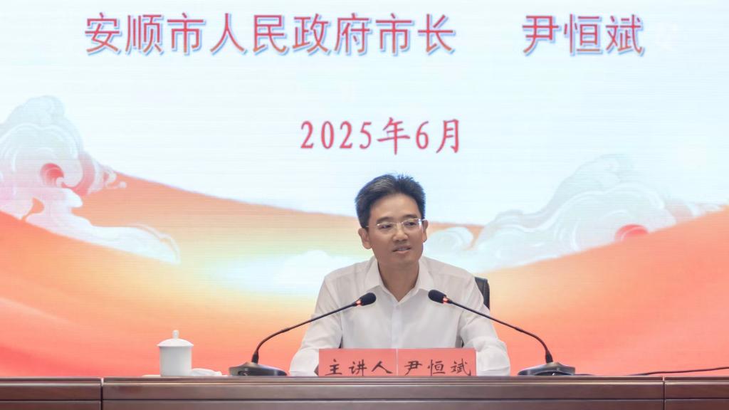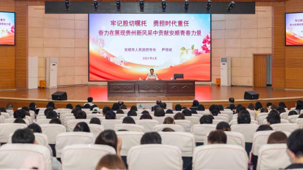 2025年6月27日下午,安顺市人民政府市长尹恒斌在安顺学院学术报告厅以“牢记殷切嘱托   勇担时代重任   奋力在展现贵州新风采中贡献安顺青春力量”为主题,为安顺学院师生讲授思想政治理论课。安顺学院党委书记程绪权,党委副书记李琳,党委委员、副校长殷红敏以及师生代表共800余人聆听学习。授课由程绪权主持。