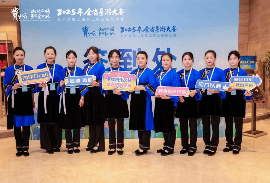 本届大赛以“赓续贵州文脉 建设旅游强省”为主题,对标国家级赛事标准,设置了主题讲解推介、综合知识问答、导游词创作、实地模拟带团、1v1 对抗及主题演讲六大环节。赛事全程贯穿文化传承理念,不仅考察选手的语言表达和知识储备,更注重检验其实际带团能力与文化传播使命。大赛首次增设英语语种赛项,要求选手以国际化视角阐释贵州文旅魅力,为国际导游班学生提供了展示外语专长的舞台。