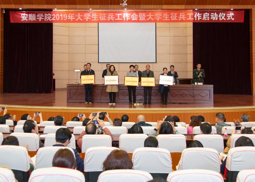 陶文彩副书记在会上宣读《中共安顺学院委员会关于表彰2018年征兵工作先进集体和先进个人的决定》,学校领导为资源与环境工程学院等10个先进集体和宋艳等23名先进个人颁发了奖牌和荣誉证书。