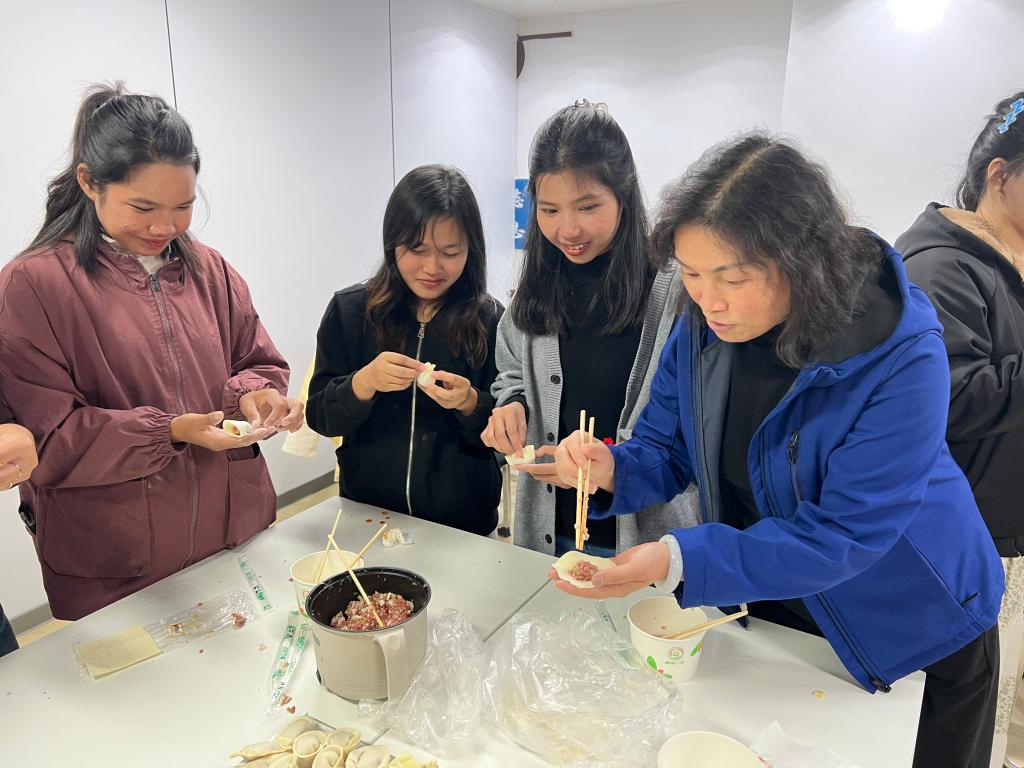 当热气腾腾的饺子端上桌,曾丽、殷红敏与学子们围坐共食,细细品尝之余,还与大家畅谈学业规划与文化感悟。一名柬埔寨学生感慨:“这是我第一次包饺子,不仅学会了新技能,更感受到了家的温暖。”